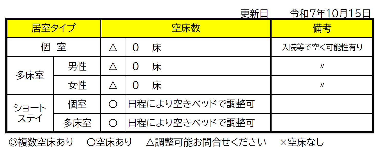 ![]() <入居に関するお問い合わせ先> 窓口担当 : 介護老人保健施設ゆとりろ 支援相談室 担当者名 : 支援相談員 岩坂・小川・伊藤・松村 受付時間 : 平日8:45-17:00、土曜8:45-12:00 連絡方法 : TEL(0138)-23-7008(支援相談室直通) (0138)-23-7223(代表) (0138)-23-5400(FAX) <備考> 空床状況は随時更新されますので、最新の情報をご確認ください。 ご質問や見学のご希望がございましたら、お気軽にお問い合わせください。 |