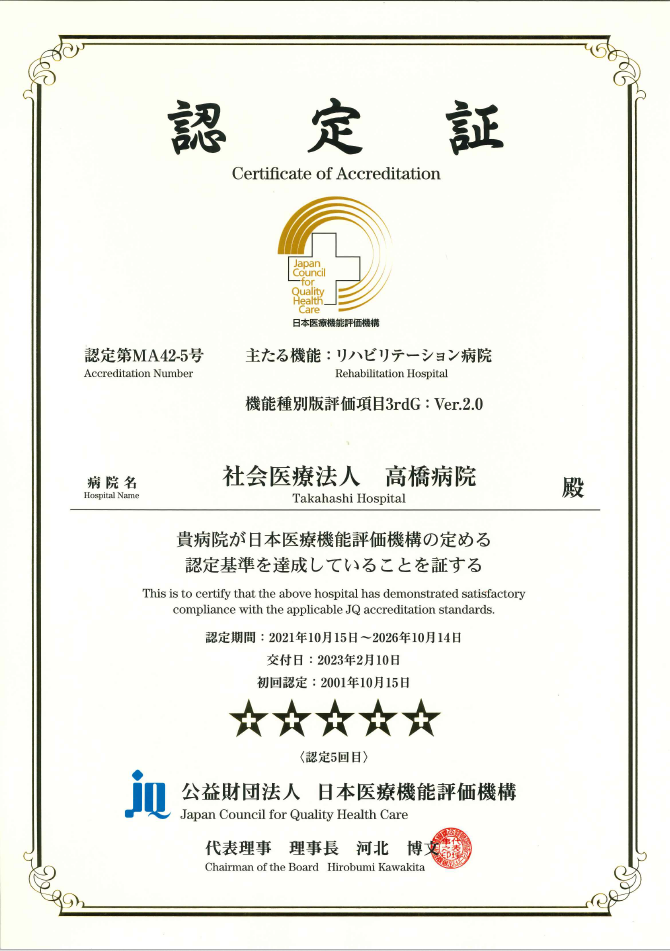 当院は、平成13年10月に公益財団法人日本医療機能評価機構より初めて認定されて以来、4度の更新審査をクリアし、今回5度目(3rdG:Ver2.0)の認定証をいただきました。
