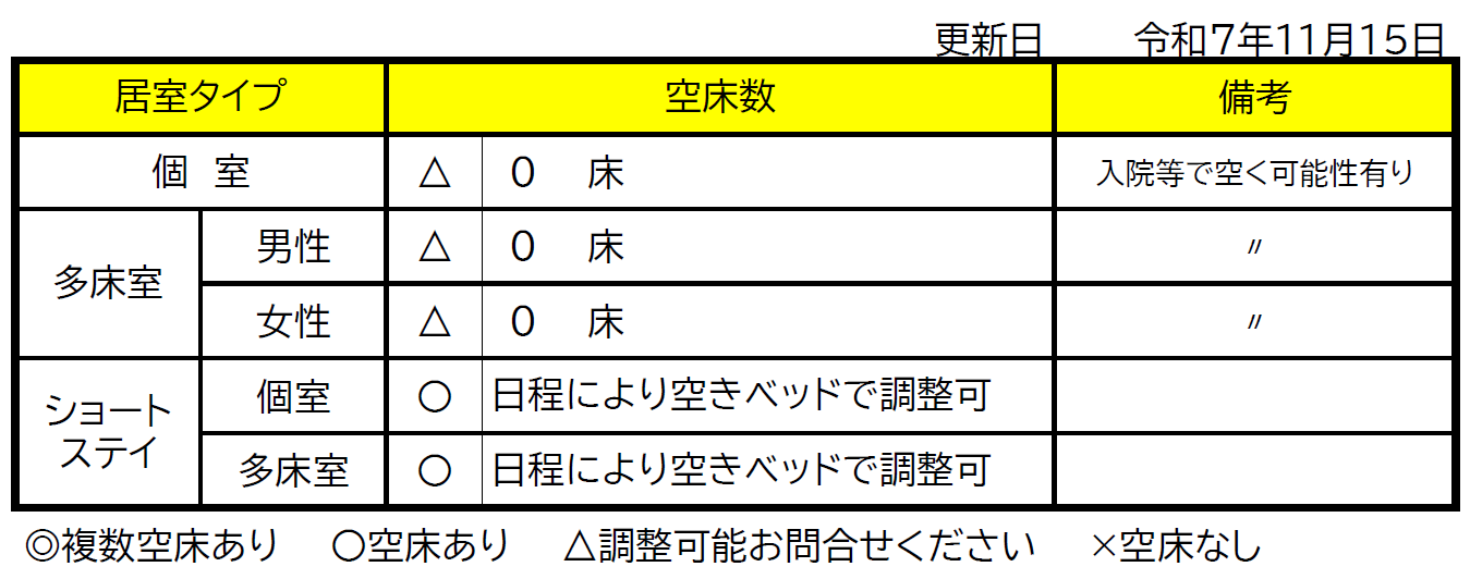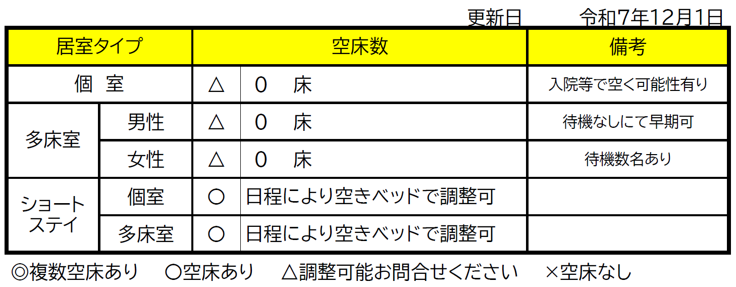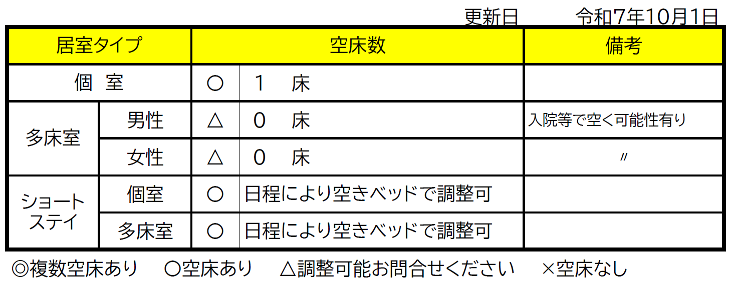 ![]() <入居に関するお問い合わせ先> 窓口担当 : 介護老人保健施設ゆとりろ 支援相談室 担当者名 : 支援相談員 岩坂・小川・伊藤・松村 受付時間 : 平日8:45-17:00、土曜8:45-12:00 連絡方法 : TEL(0138)-23-7008(支援相談室直通) (0138)-23-7223(代表) (0138)-23-5400(FAX) <備考> 空床状況は随時更新されますので、最新の情報をご確認ください。 ご質問や見学のご希望がございましたら、お気軽にお問い合わせください。 |